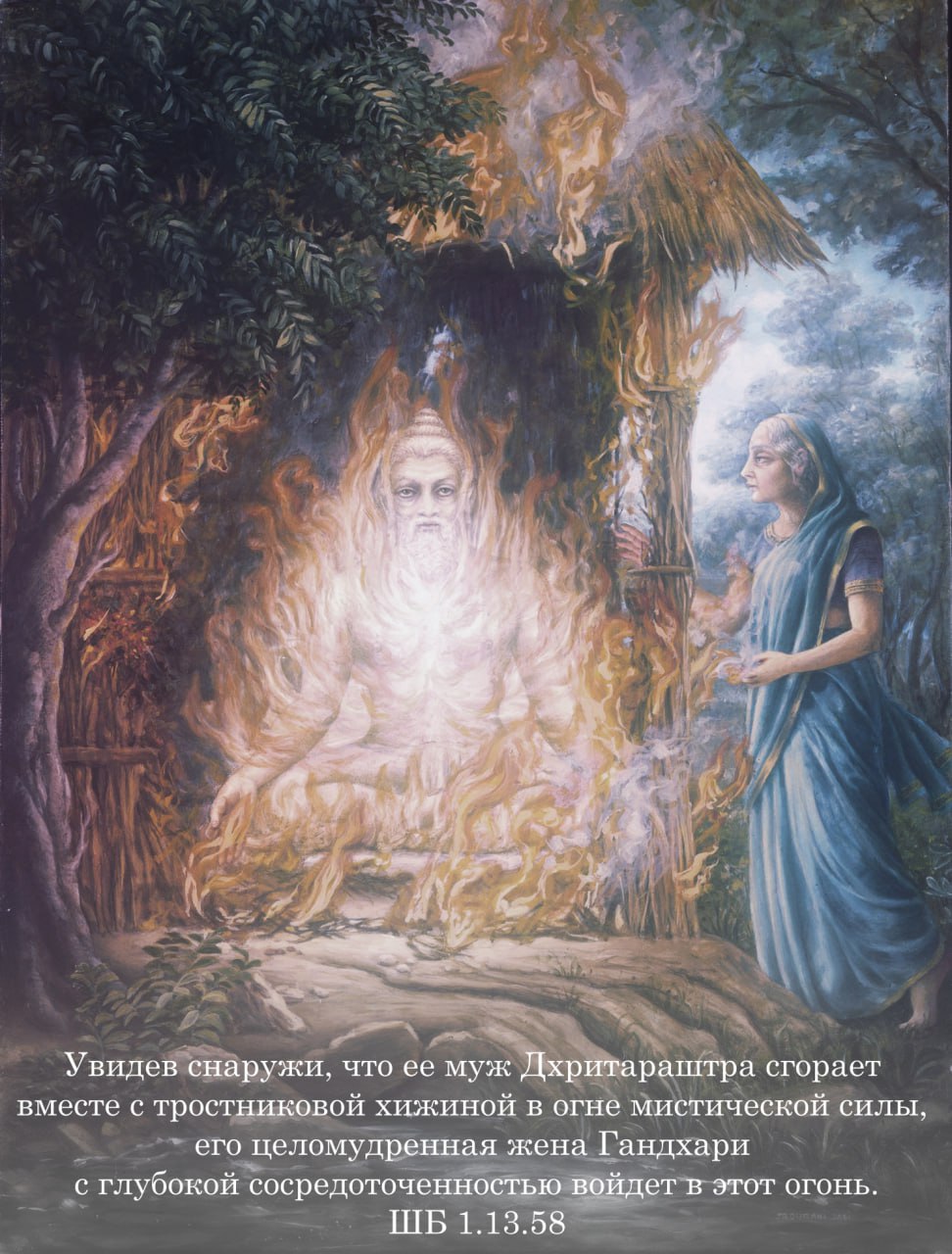 Гандхари была идеальной целомудренной женщиной, спутницей жизни своего мужа, поэтому, увидев, как ее муж сгорает вместе с тростниковой хижиной в огне мистической йоги, она пришла в отчаяние. Она покинула дом, потеряв сто своих сыновей, а теперь, в лесу, наблюдала, как охваченный пламенем сгорает ее любимый муж. Тут она действительно ощутила свое одиночество и вошла в огонь, последовав за своим мужем и в смерти. Когда целомудренная женщина входит в огонь, сжигающий ее покойного мужа, это называется обрядом сатӣ, и считается, что если женщина исполнила его, то она достигла совершенства. Позже обряд сатӣ превратился в омерзительное преступление, так как его стали проводить насильно, даже вопреки желанию женщины. В эту эпоху деградации ни одна женщина не способна совершить его так же целомудренно, как Гандхари и другие женщины прошлого. Целомудренную жену, подобную Гандхари, разлука с мужем жгла сильнее, чем огонь. Такая женщина способна совершить обряд сатӣ добровольно, и для этого не требуется чье-то преступное насилие. Когда же обряд превратился в пустую формальность и женщину стали силой принуждать следовать этому обычаю, он действительно стал преступлением, поэтому такая церемония была запрещена законом. Предсказание Нарады Муни удержало Махараджу Юдхиштхиру от попыток разыскать свою овдовевшую тетку.